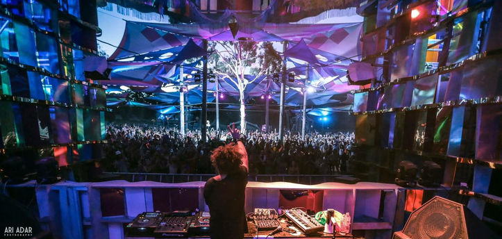 Constructed using modular iridescent panels, the stage transforms dynamically under shifting light, creating a mesmerizing play of colour and reflection. At night, integrated LED mapping and projection design bring the structure to life, amplifying the energy of the music and audience. Suspended organic elements and layered textures soften the geometric framework, adding an ethereal, surrealist touch to the stage environment.